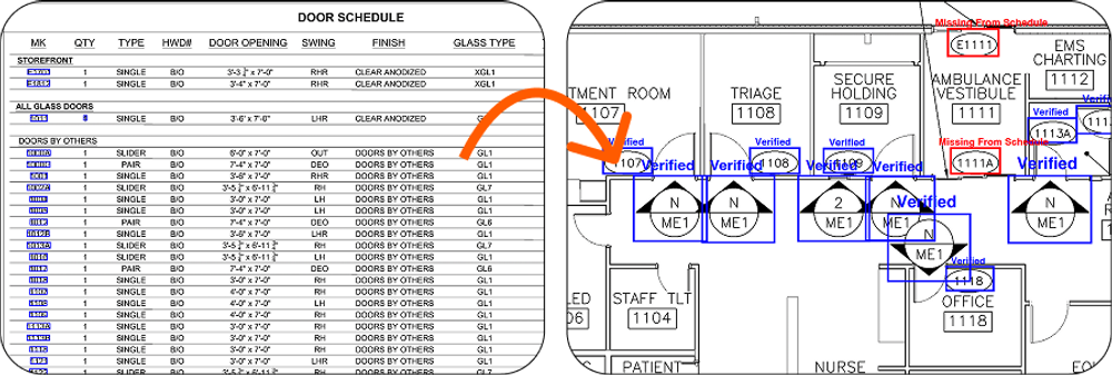 Door tags are scattered across hundreds of floor plans, making manual verification against massive, complex schedules nearly impossible. Missing a single tag or misinterpreting a hardware type means ordering the wrong materials, directly impacting your budget and delaying the project. MarkedUp automates this cross-reference, ensuring every door on the plan perfectly matches the schedule for a flawless bid package.